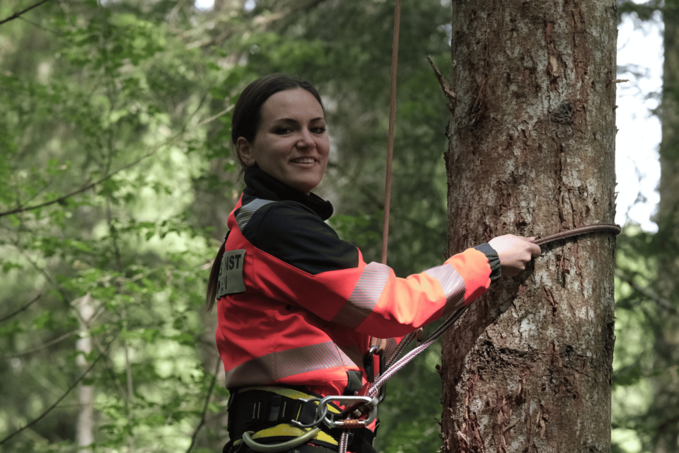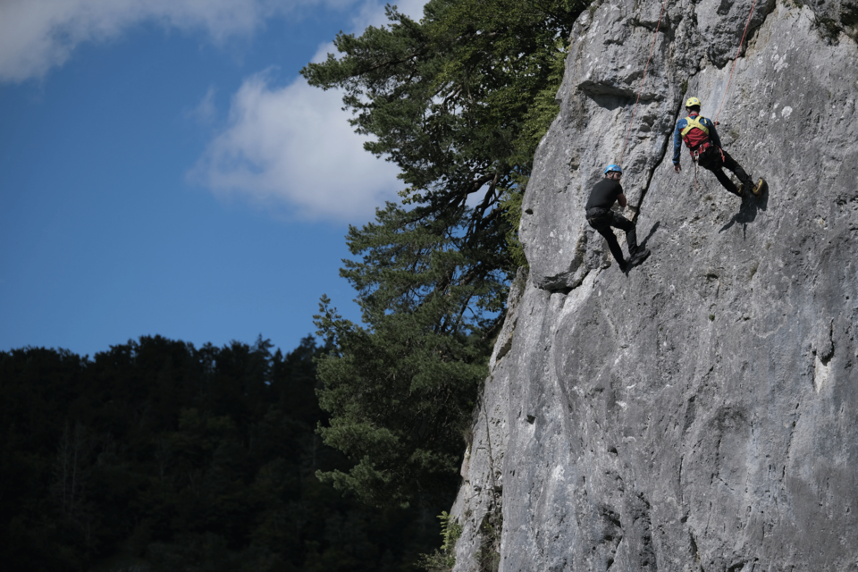 Am zweiten Tag hieß es: Selber aktiv werden! Unter fachkundiger Anleitung der Bergretter:innen übten die Schüler:innen das Abseilen an rund 80 Meter hohen Felsen, den Aufstieg mit Baumsteigeisen und den Einsatz spezieller Tragen, wie der Kongtrage und des Luftrettungssacks.