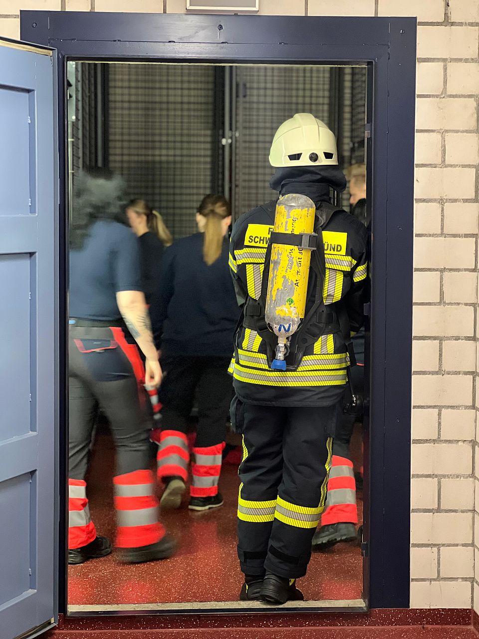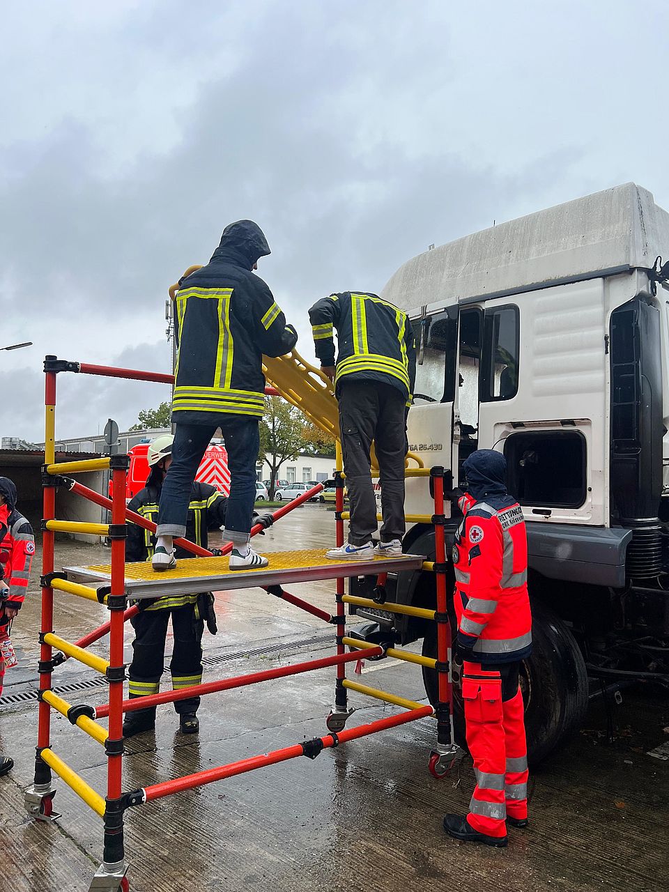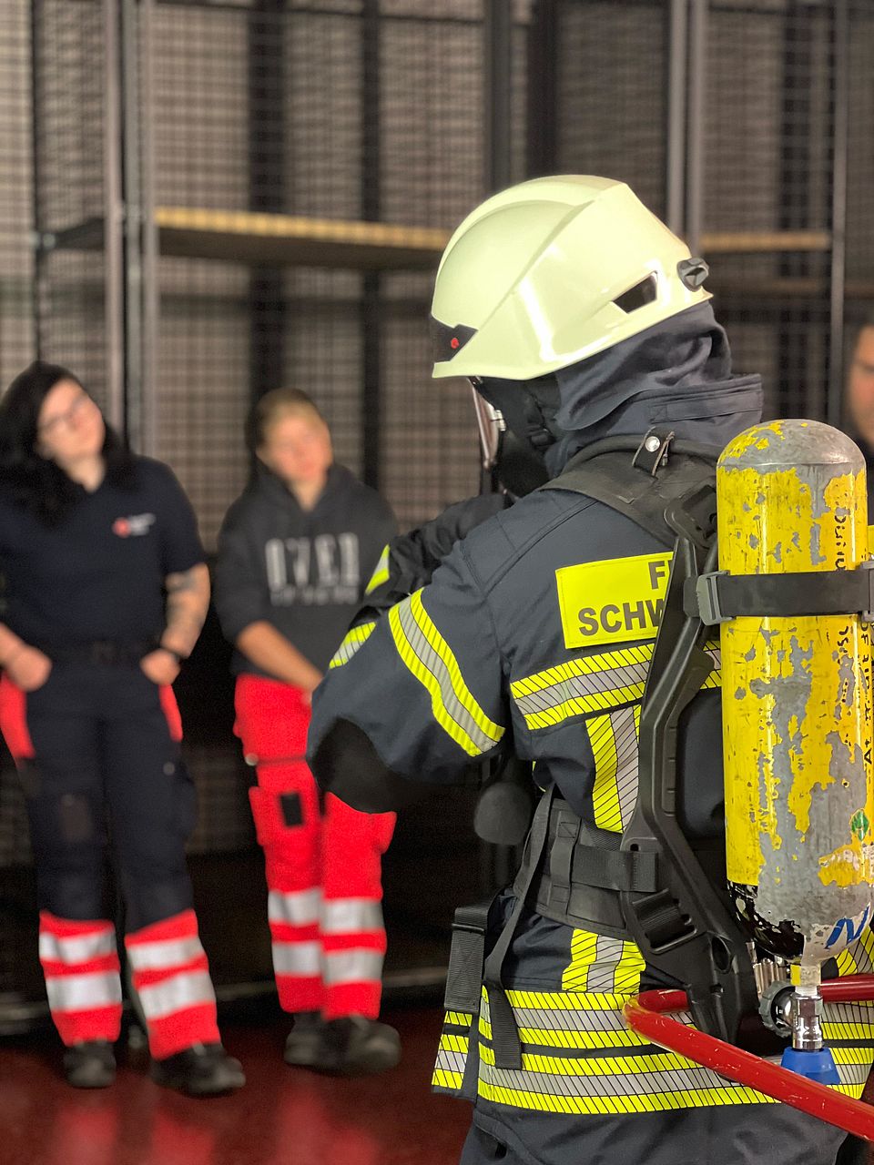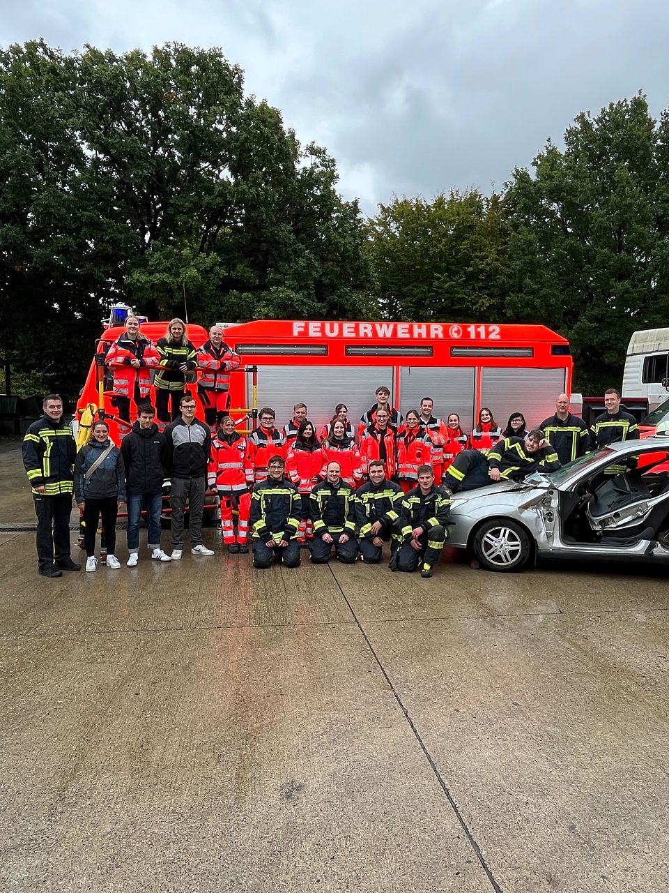 Auf dem Programm standen die Rettung mit der Drehleiter, Atemschutz-Training, der Einsatz von Feuerlöschern sowie die technische Rettung aus LKW und PKW mit Schere und Spreizer.
