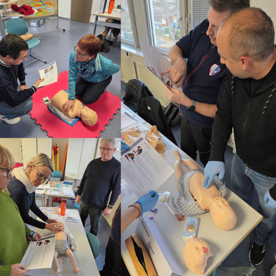 Im praktischen Teil wurden Maßnahmen an bewusstlosen Kindern und Säuglingen intensiv geübt – orientiert an den verbindlichen Praxisanleitungen. Ein besonderes Highlight war die Methode „Kasperles Erben“ von Prof. Dr. Harald Karutz, die zeigt, wie psychische Erste Hilfe Kindern vermittelt werden kann.